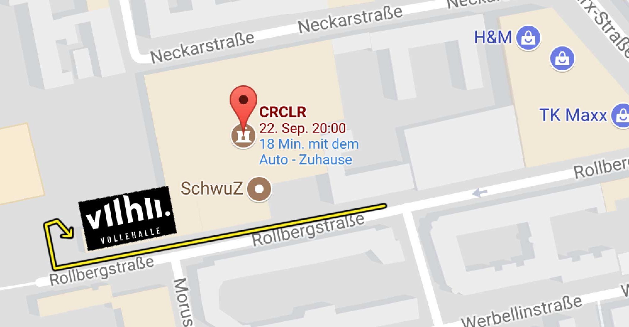 Die Adresse des CRCLR House ist Rollbergstraße 26, aber es ist einfacher, bei Google Maps die Rollbergstraße 37 einzugeben. Wenn man auf dem Weg dorthin von der Karl-Marx-Straße aus die Rollbergstraße hochfährt oder hochläuft, kommt auf der rechten Straßenseite nach Hausnummer 24 zunächst eine Hofeinfahrt, wo auch der Club SchwuZ zu finden ist. Daran muss man vorbei und weiter an einem langen Gebäude entlang. In diesem Gebäude findet vollehalle statt. Nach ca. 70 m geht nach rechts eine Auffahrt hoch, dort muss man hochlaufen, man kommt auf eine Art Freifläche, und dann muss man nach rechts biegen, und sieht den Eingang des CRCLR House rechts oberhalb. Die Treppe hoch zum Eingang ist aus gestapelten Europaletten gebaut.